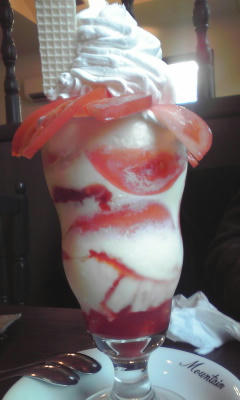 まぁ いける範囲いける範囲。というわけで注文してきたのが画像なんすが、サイズはだいたい普通のパフェの二倍くらい。あとから聞いたら その店はゲテモノとでか盛りセットで有名だとかなんだとか。まあ 食べましたけど。